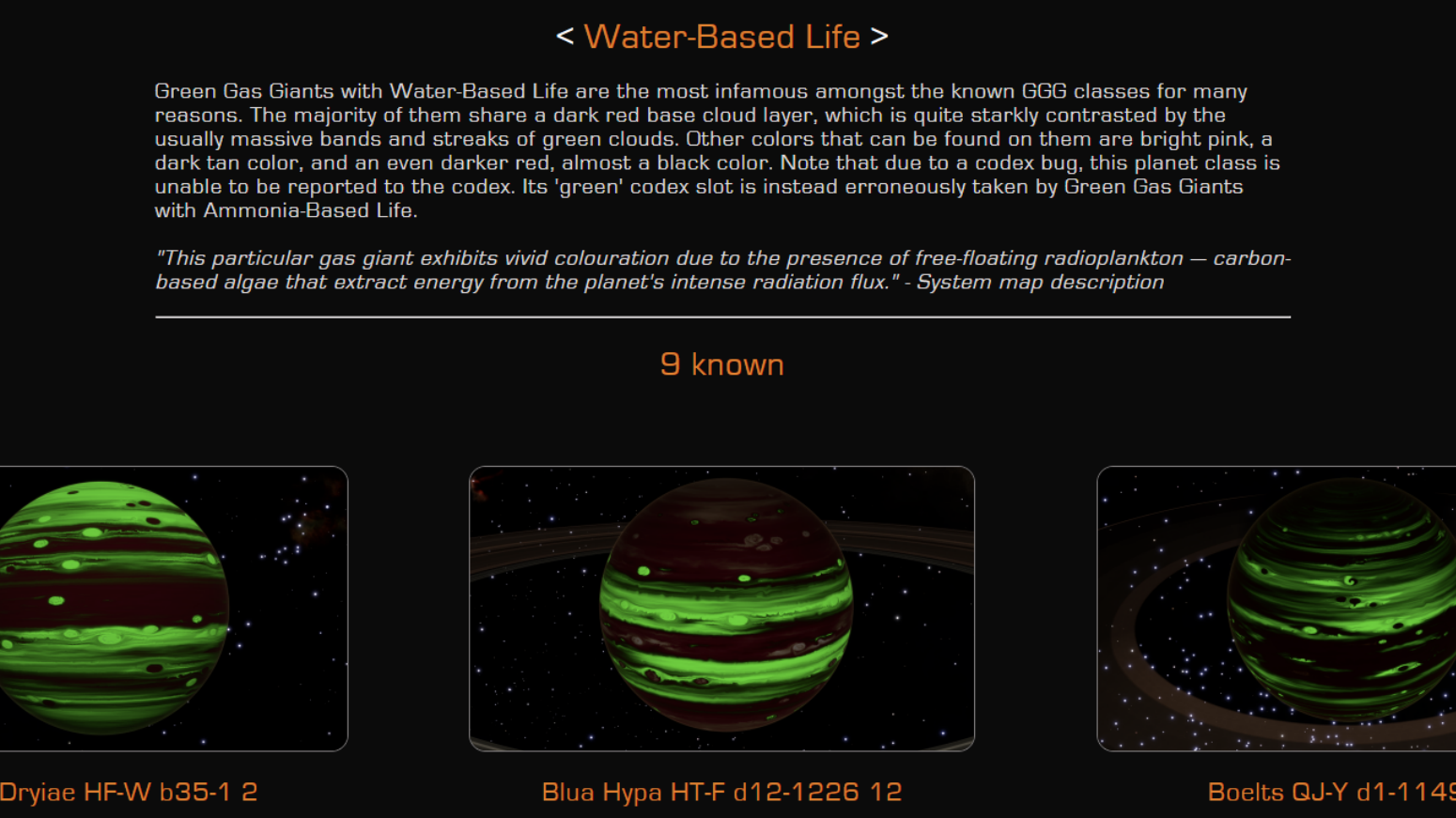 Most importantly, the special planet description that Green Gas Giants are given in the system map is also included here to help you remember how to differentiate it