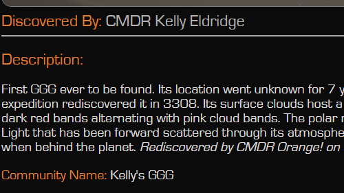 The first GGG was discovered in 3301. Interest arose over the next few years regarding these strange "glowing green gas giants", as nicknamed by the exploration community. These planets served as hot tourist destinations, as there were only a handful known to exist. With the release of the codex, these planets were recognized as an entirely separate planet type from their standard counterparts. The canon reasoning behind them being green is due to 'extremophile bioluminescent life' in their upper cloud decks. In more recent years, new GGG reports have lessened due to the game's lower player count. See all GGG locations on EDAstro's map