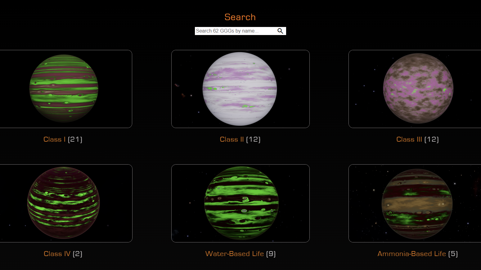 edGGG's landing page is the search page. You can select a planet class to view GGGs designated under that class, or manually enter the name of a known Green Gas Giant to be taken to its information page. At the bottom of the Search page is the 'New This Year' section which will show all new GGGs discovered in the current in-game year. You can also click on their picture to be taken to their respective information page.