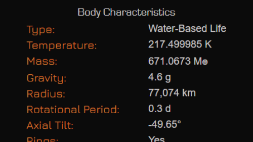 The Information Page is where you can view any GGG in great detail. The main image will always be the planet fully lit. You can use the arrows on either side of the frame to view more pictures of the planet from different perspectives, as well as from nearby moon surfaces, if applicable. The system map will always be the last picture of the carousel (Click the left arrow once from main image). All of these images are taken by me using the in-game High-Resolution Screenshot feature.