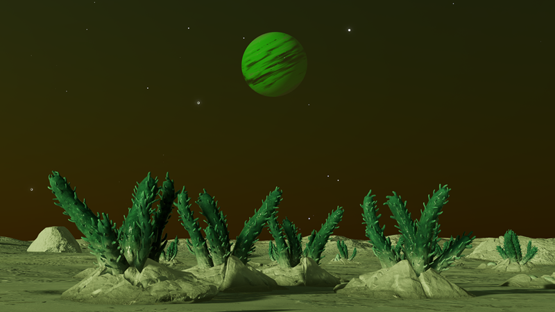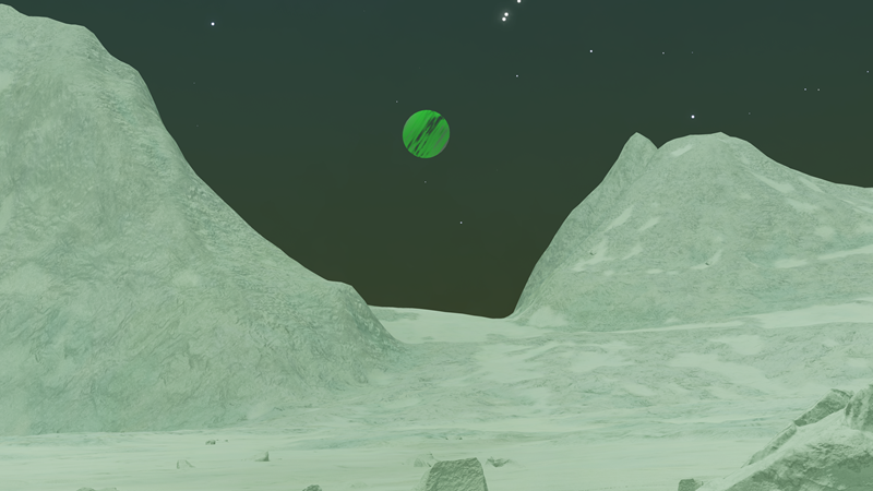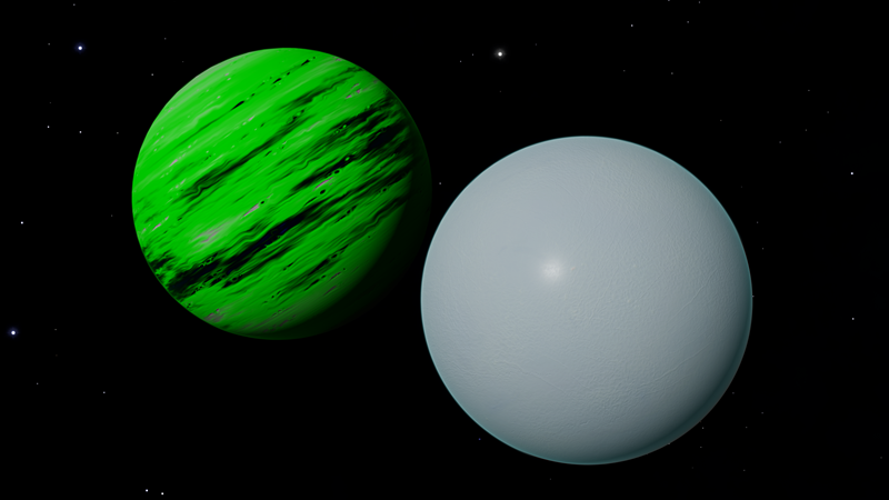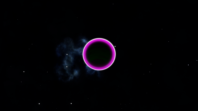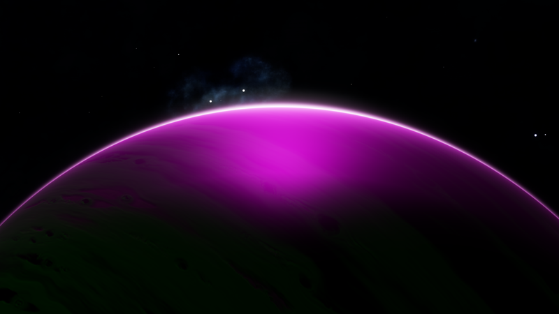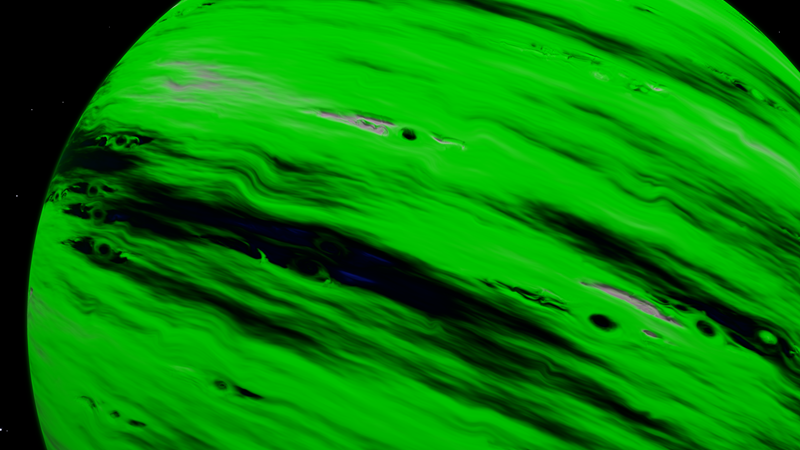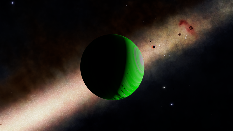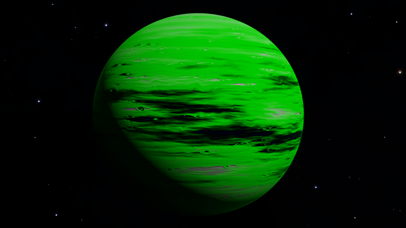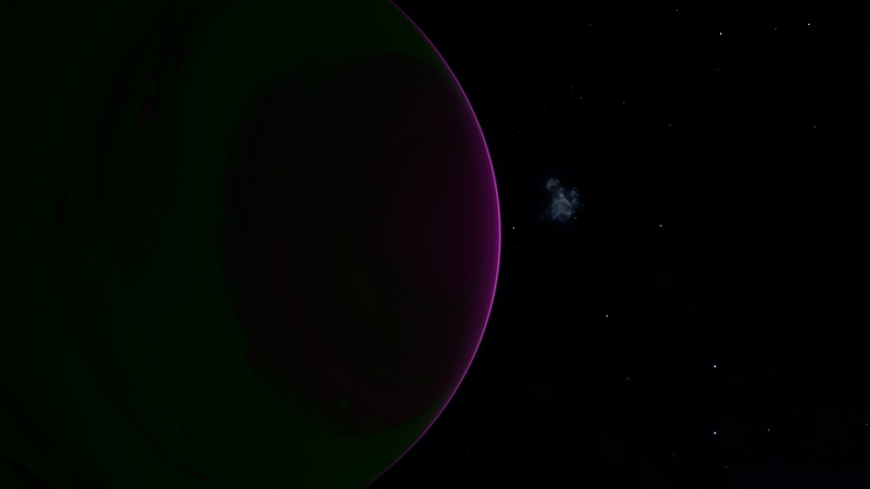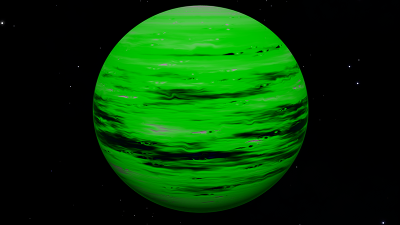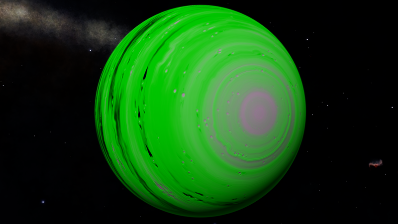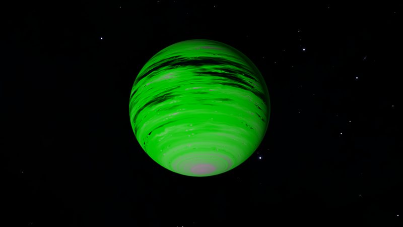 Unbelievably, this planetary lightshow is a Class I Green Gas Giant! Its colors and cloud patterns very closely resemble Class III GGGs at 610 K. This is probably because their normal variants share common colors. The planet is orbited by a whopping 10 moons, 4 of which have landable atmospheres. Having a high orbital inclination and an eccentricity of 0.1821, this planet either had its orbit disrupted, or was captured.